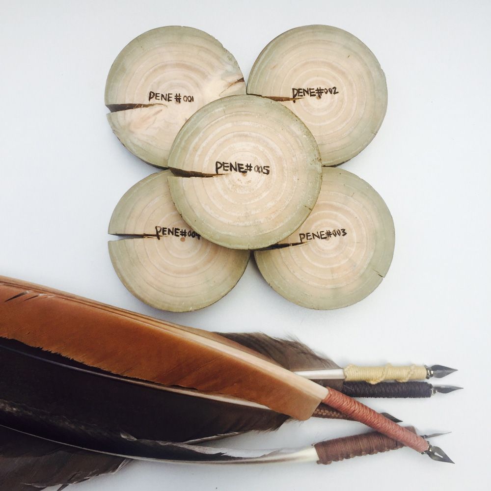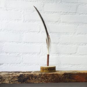 Het is gemaakt van een grote vogelveer met een handgeknoopt waxkoord om het schrijfcomfort te verhogen.